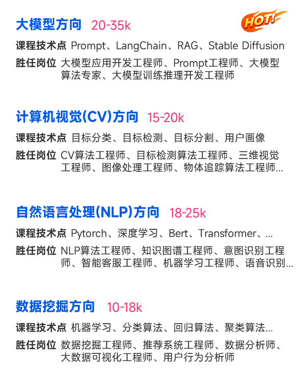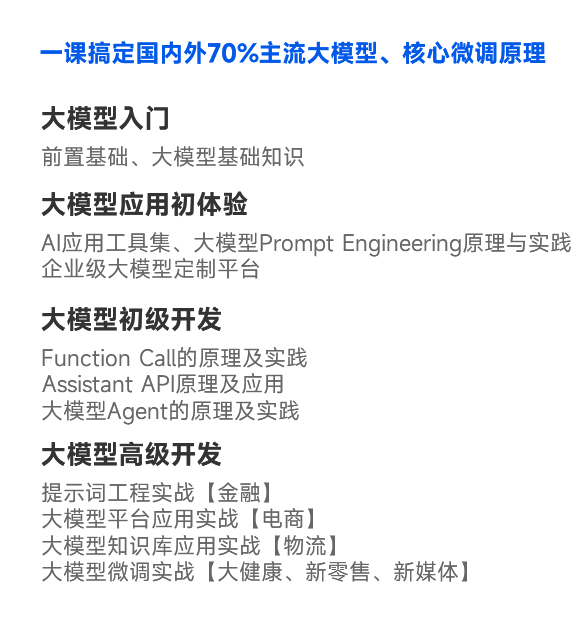 1. 大模型语言进阶 2. 数据处理与统计分析 3. 机器学习基础 4. 数据挖掘项目实战 5. 深度学习基础 6. NLP自然语言处理基础 7. 自然语言处理项目1 8. 大模型RAG开发项目 9. 大模型Agent开发项目 10. 大模型微调开发项目 11. 大模型核心专题 12. 自然语言处理项目2 13. 自然语言处理实战 14. 面试加强课 15. 图像分析基础 16. 多模态大模型项目